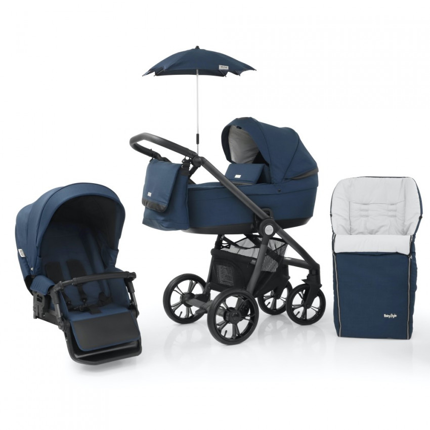 BabyStyle Prestige3 Active 6v1 obsahuje rám kočárku, hlubokou korbu, sedací část, tašku, fusak a slunečník
