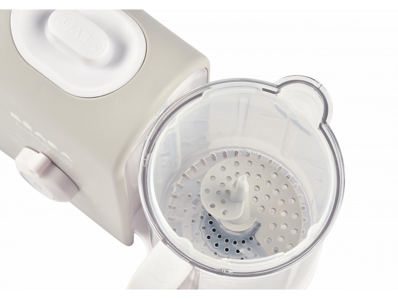 hcete-li následně pokrm rozmixovat, pouze vysypete uvařené suroviny z vkládacího košíku do průhledné hlavní nádoby a rozmixujete (podle věku dítěte na jemnou hladkou kaši, nebo na hrubší strukturu s kousky)