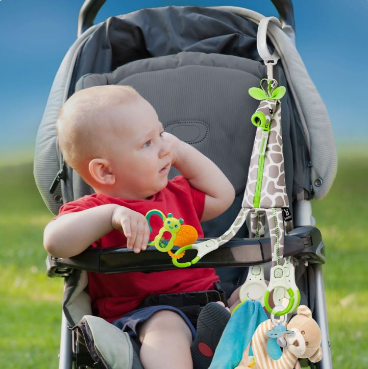 včetně 4 bezpečných háčků, na které můžete zavěsit oblíbenou hračku dítěte, muchláček a další