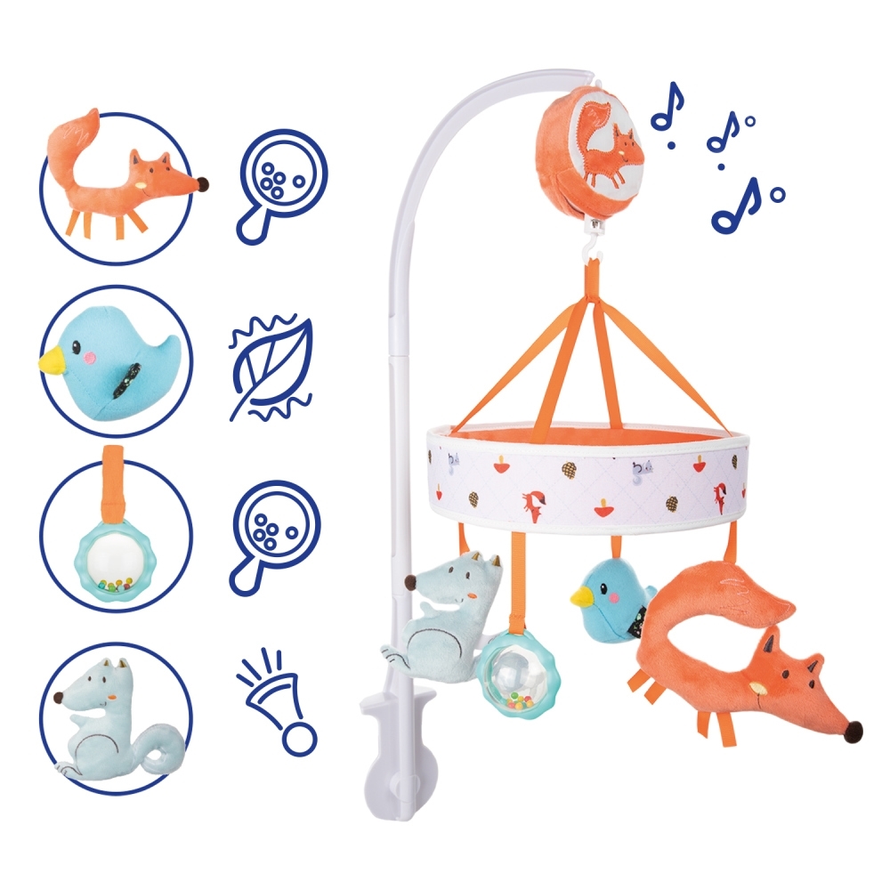 Upevněte tuto hračku mimo dosah dítěte. Odstraňte tuto hračku, když se dítě začíná pokoušet vstávat na ruce a na kolena v lezoucí poloze, abyste předešli možnému zranění zapletením. Správnou montáž musí před použitím provést a zkontrolovat dospělá osoba. Před každým použitím pečlivě zkontrolujte. Nepoužívejte poškozenou nebo opotřebovanou hračku. Poškozenou nebo opotřebenou hračku zlikvidujte v souladu s nařízením pro likvidaci odpadu. V případě zjištění nefunkčnosti motorku (např. rozladěné přehrávání) přestaňte hračku používat a kontaktujte svého prodejce nebo distributora, aby zjistili příčinu závady. Před montáží hračky odstraňte všechny obalové prvky. Odstraňte obal z dosahu dítěte, abyste předešli riziku udušení. Uschovejte obal pro pozdější použití.