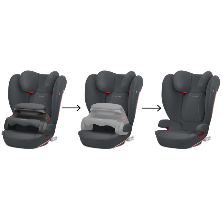 • děti přibližně do 3 let (do 15 kg) jsou v autosedačce jištěné pomocí bezpečnostního pultu, poté jednoduchou úpravou autosedačku přeměníte na podsedák s vysokou opěrkou zad