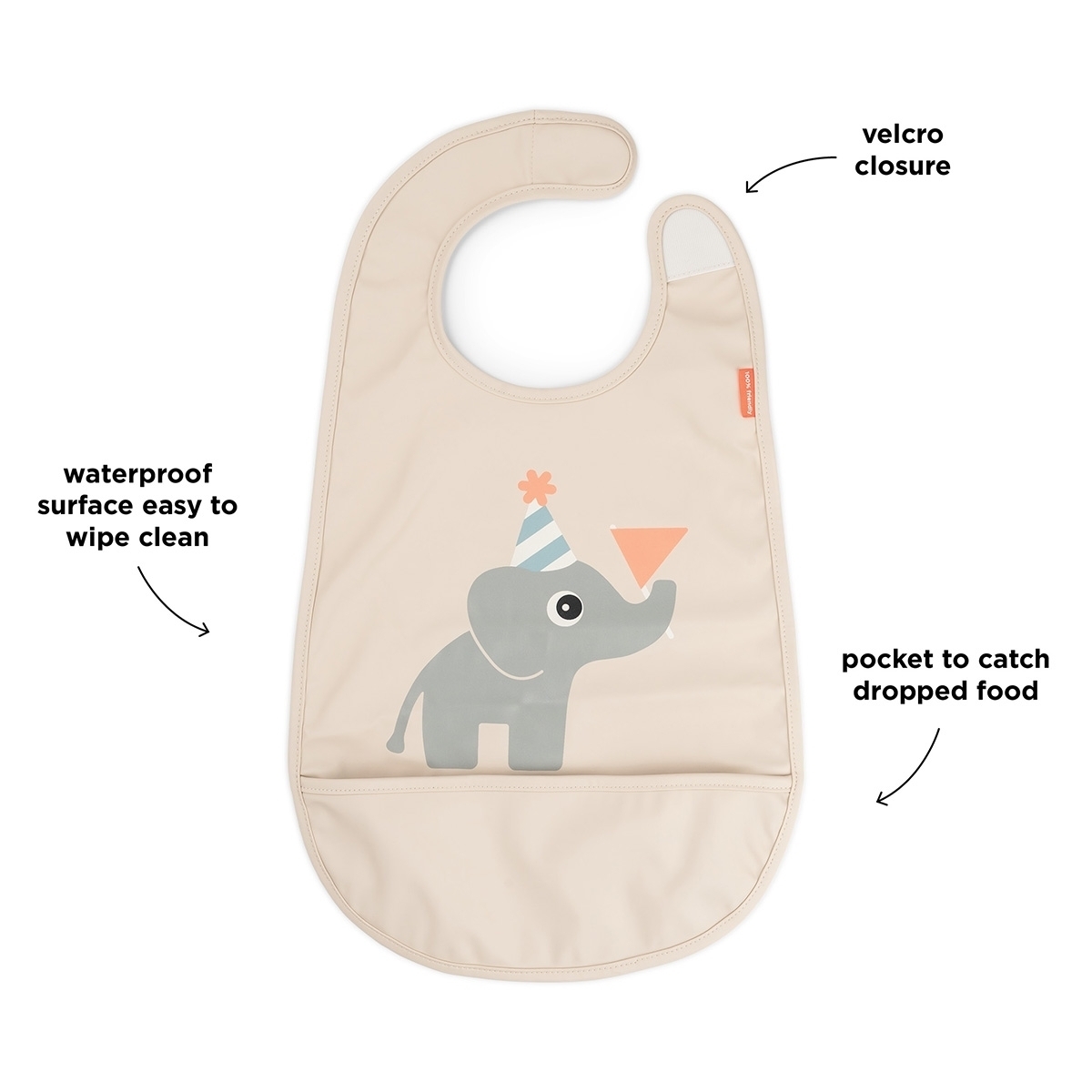 • voděodolný povrch zajišťuje, že oblečení zůstane čisté a po zaneřáděném jídle se snadno otírá