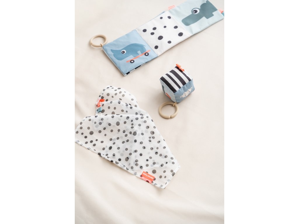 • drobná sada smyslových hraček s fazolkovým vakem, malým šátkem a roztomilým chrastítkem Birdee