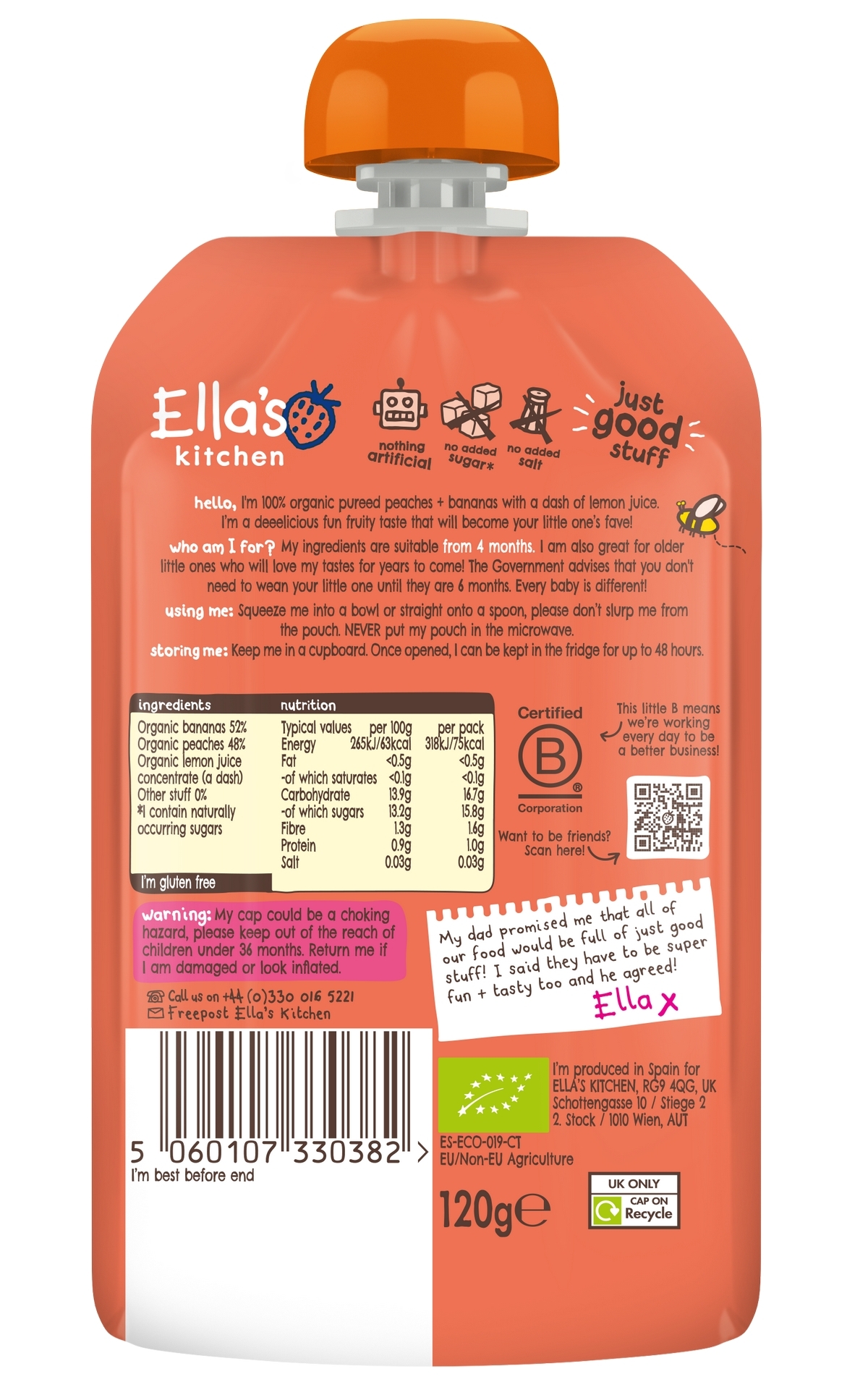 Návod k použití: Není určeno k ohřívání v mikrovlnné troubě. Abyste obsah kapsičky zahřáli, postavte ji do horké vody a zkontrolujte, aby voda nebyla příliš horká. Pak kapsičku vymačkejte do misky nebo rovnou na lžíci. Před podáváním zkontrolujte teplotu. Pokud je kapsička skladovaná při pokojové teplotě, je možné její obsah konzumovat přímo bez ohřívání.