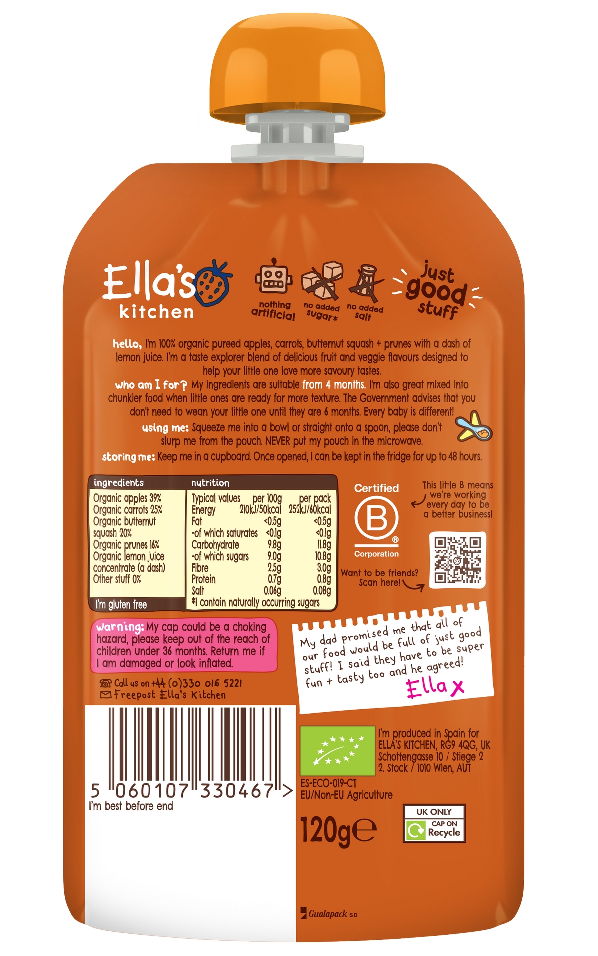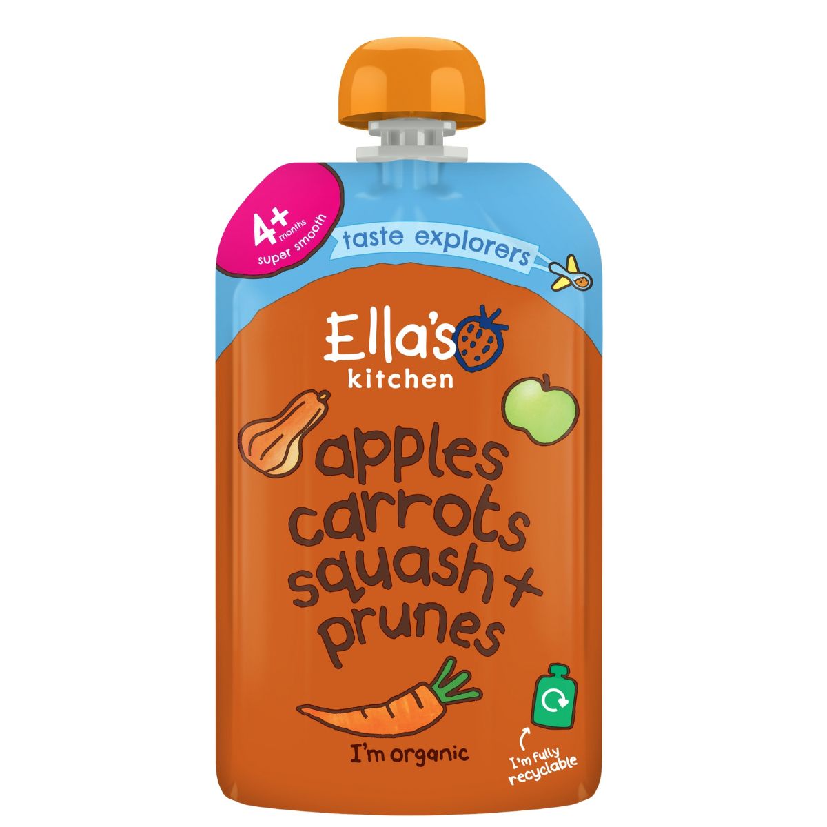 Složení: BIO jablka 39 %, BIO mrkev 25 %, BIO máslová dýně 20 %, BIO švestky 16 %, koncentrát z BIO citronové šťávy