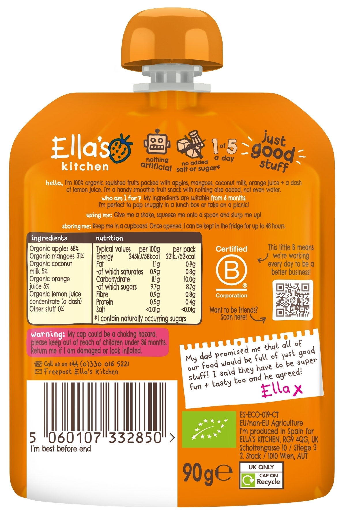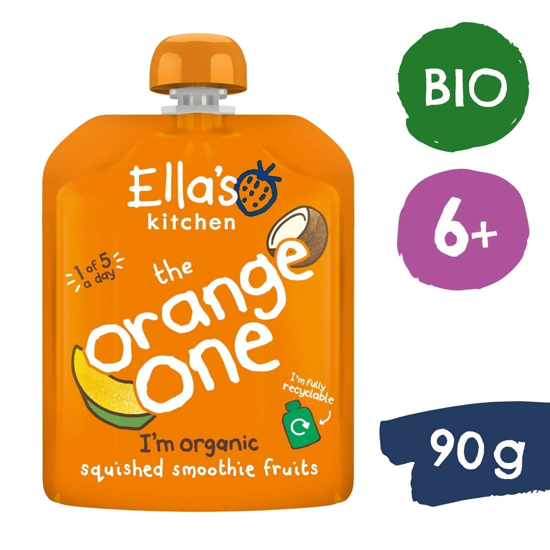 Složení: BIO jablka 68 %, BIO mango 21 %, BIO kokosové mléko 5 %, šťáva z BIO pomeranče 5 %, koncentrát BIO citronové šťávy.