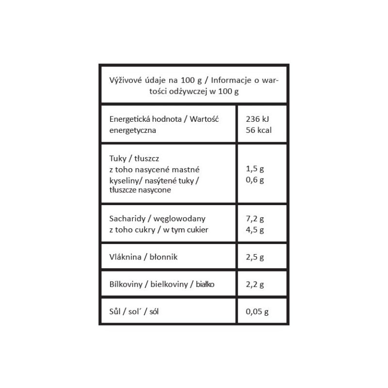nutriční hodnoty/100 g - energ. hodnota 236 kj/56 kcal, bílkoviny 2,2 g, sacharidy 7,2 g, z toho cukry 4,5 g, tuky 1,5 g, z toho nasycené mastné kyseliny 0,6 g, vláknina 2,5 g a sůl 0,05 g