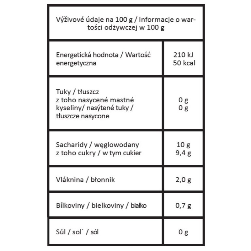 nutriční hodnoty/100 g - energ. hodnota 210 kj/50 kcal, bílkoviny 0,7 g, sacharidy 10 g, z toho cukry 9,4 g a vláknina 2 g
