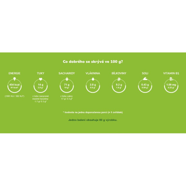 složení Bio pšeničná mouka (65,6 %), Bio koncentrát hroznové šťávy (23,1 %), Bio slunečnicový olej (10,7 %), kypřící látky, esenciální olej z Bio citrónu, vitamín B1, může obsahovat stopy mléka, ořechů a vajec