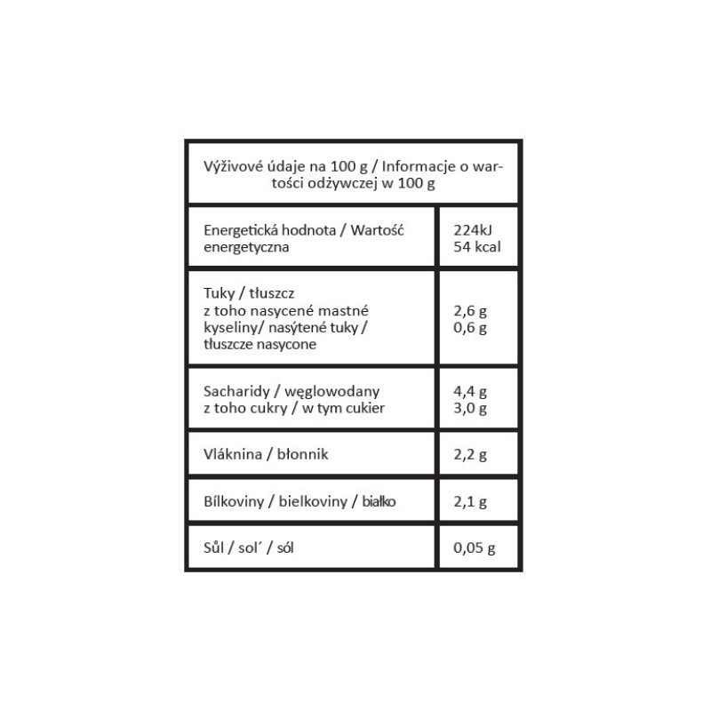 nutriční hodnoty/100 g - energ. hodnota 224 kj/54 kcal, bílkoviny 2,1 g, sacharidy 4,4 g, z toho cukry 3 g, tuky 2,6 g, z toho nasycené mastné kyseliny 0,6 g, vláknina 2,2 g a sůl 0,05 g