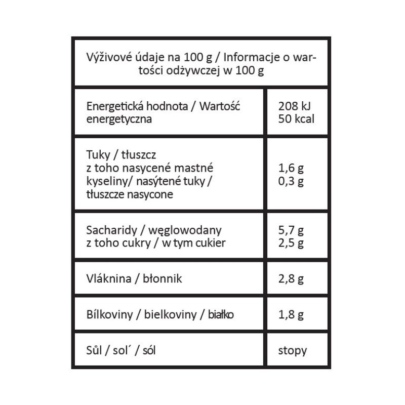 nutriční hodnoty/100 g - energ. hodnota 208 kj/50 kcal, bílkoviny 1,8 g, sacharidy 5,7 g, z toho cukry 2,5 g, tuky 1,6 g, z toho nasycené mastné kyseliny 0,3 g, vláknina 2,8 g a špetka soli