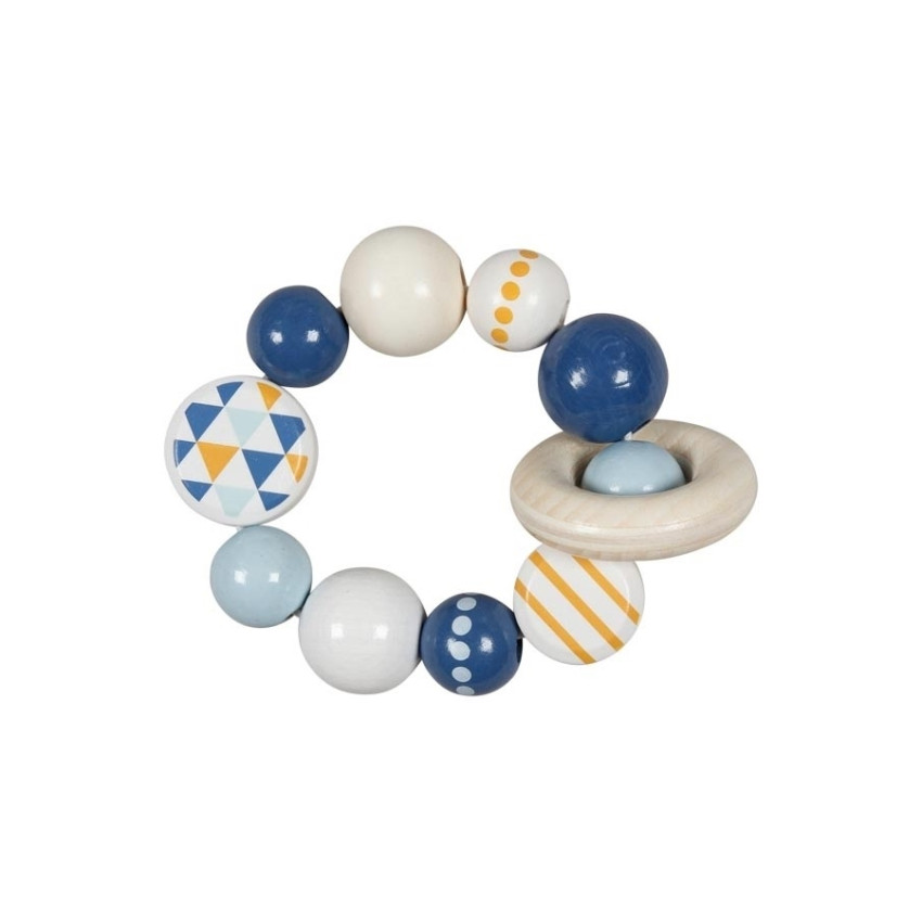 modro-žluté chrastítko s kroužkem je dřevěná hračka pro první kontakt ručiček a úchop