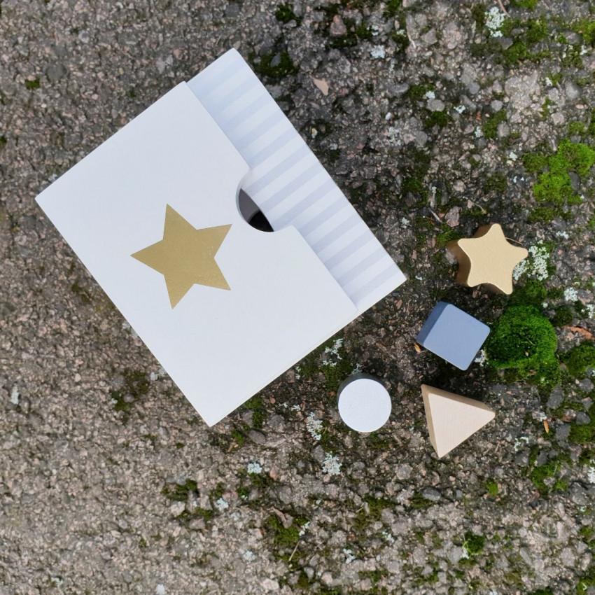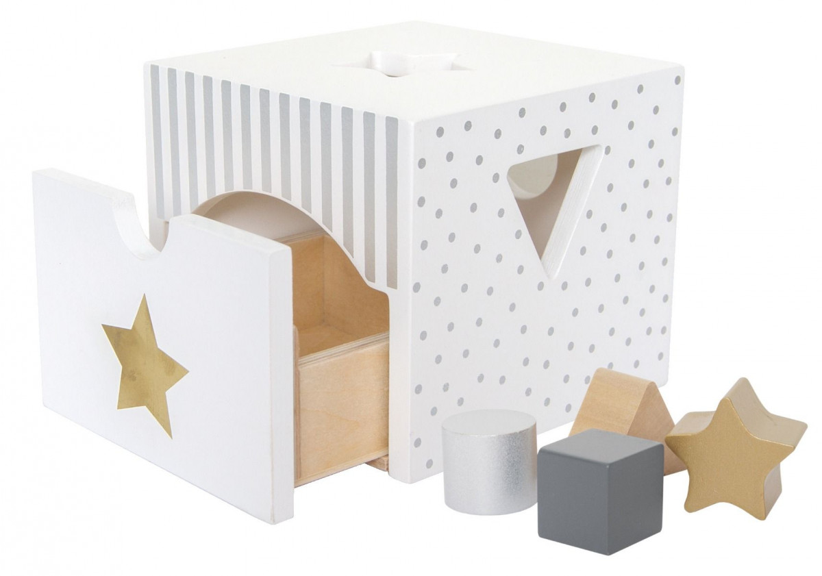 • hračka zahrnuje kostku a 4 kousky různých tvarů a barev, které se vejdou do různých otvorů