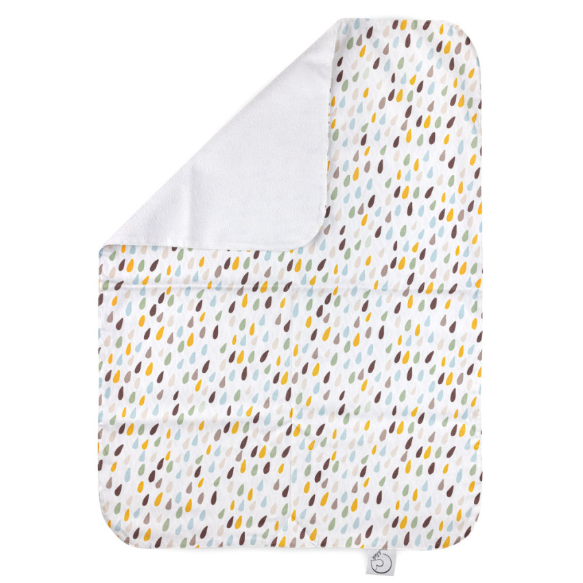 • přebalovací látková podložka se skládá ze dvou materiálů, nahoře je bílé froté s PUL zátěrem (froté je příjemné na dotek pro miminko a při nehodě PUL zátěr zabrání prosáknutí do dalších vrstev) a spodní vrstva je ušita z designové bavlněné látky