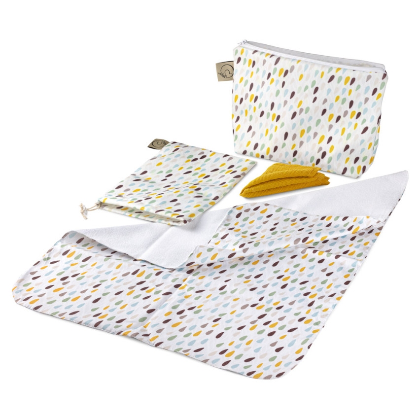 • balení obsahuje kosmetickou taštičku, přebalovací látkovou nepromokavou podložku, nepromokavý pytlík na pleny a jemný mušelínový ubrousek