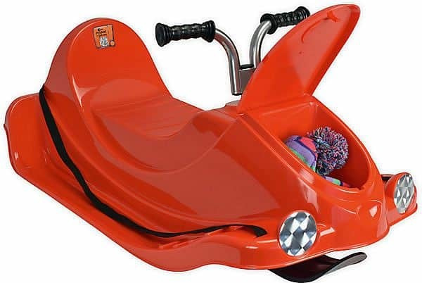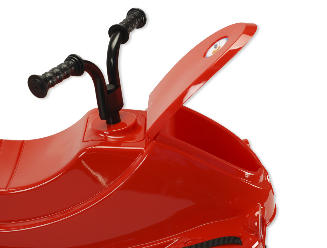 • v přední části je vytvořen úložný prostor na malou hračku nebo případně další potřebné věci (tento úložný prostor je zakryt víkem, takže uložené věci jsou chráněny před nepřízní počasí a odletujícím sněhem)