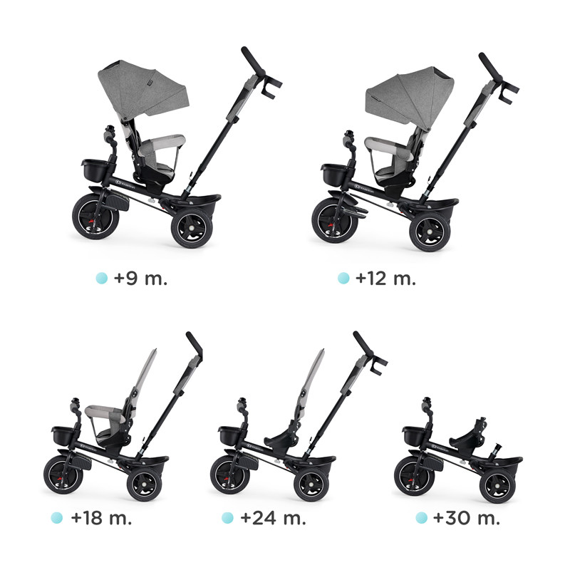 tříkolka má sedadlo otočné o 360°, které lze nastavit čelem k rodiči, nebo čelem po směru jízdy (dítě se bude cítit jistěji, když Vás bude mít zpočátku na dohled)