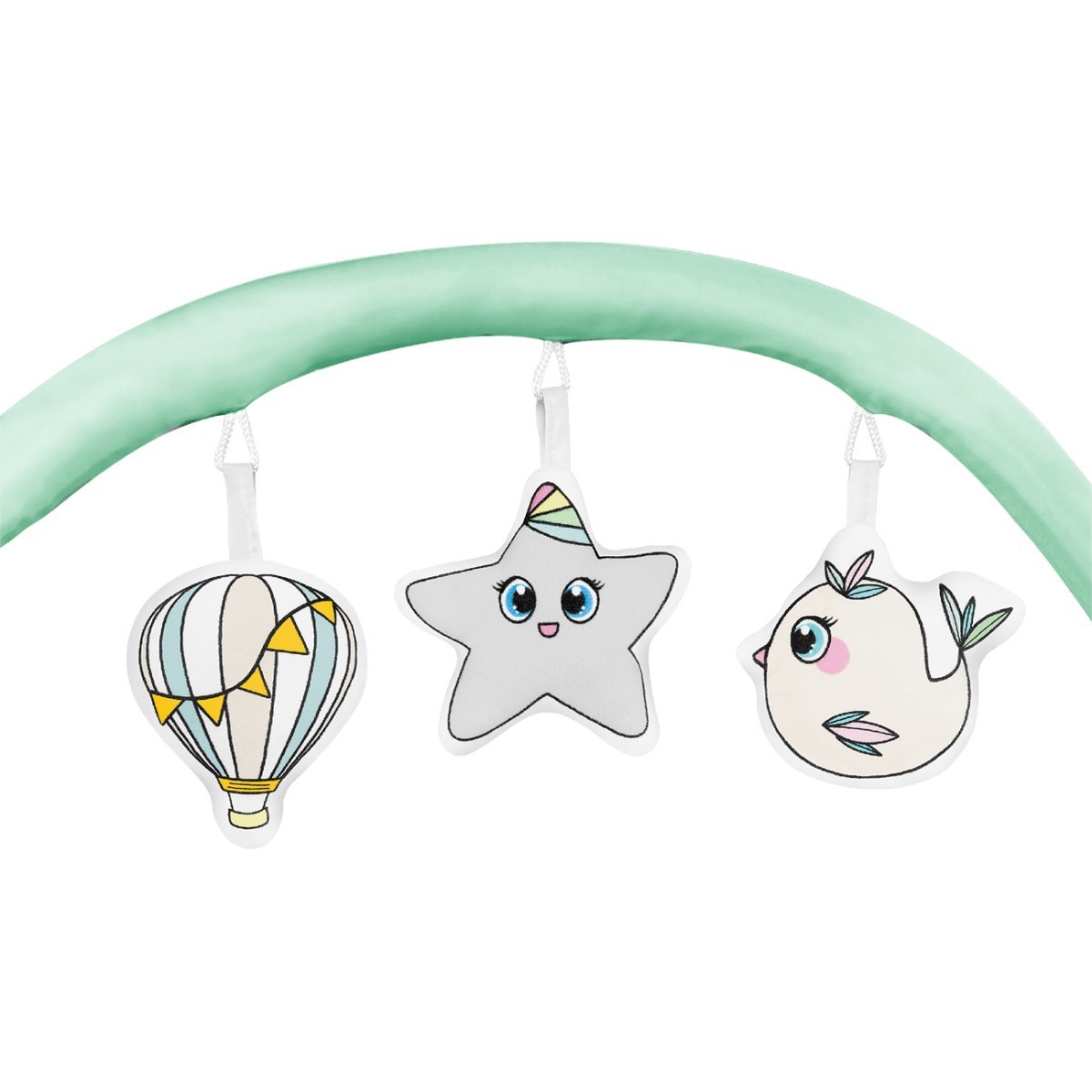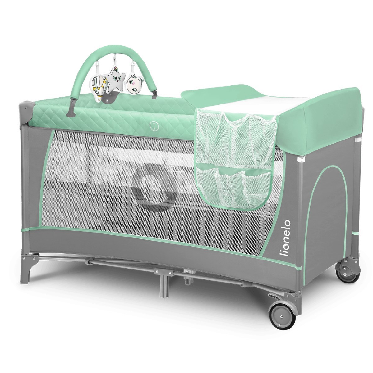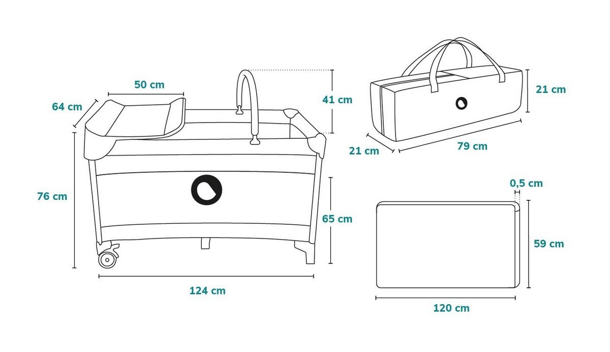 součástí balení je také hrazda s interaktivními hračkami, přebalovací pult s organizérem, vložé lůžko, matrace a taška na postýlku