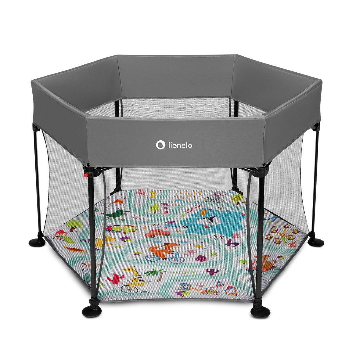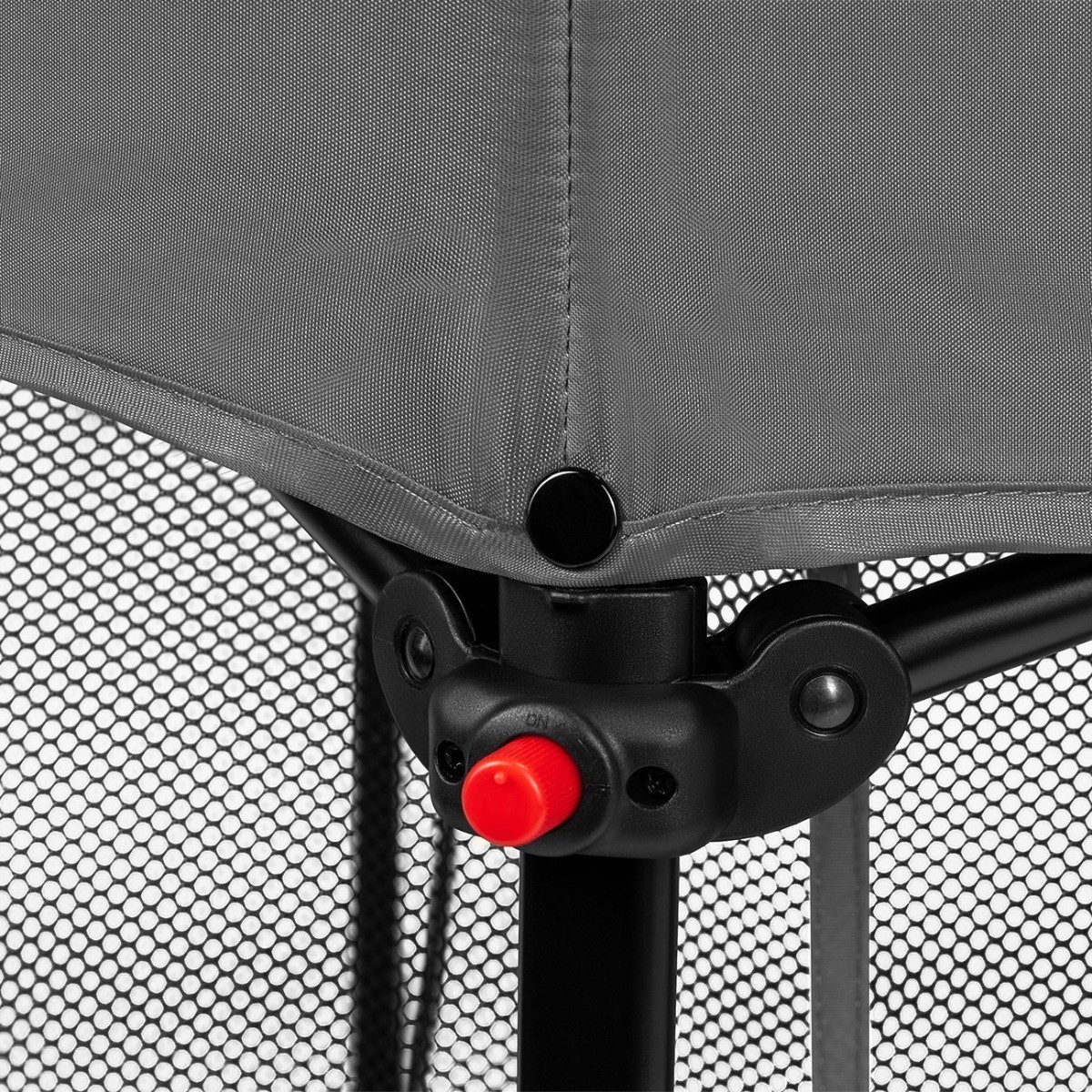 horní část ohrádky s kovovými klouby pro skládání a rozkládání je zajištěna širokým pružným panelem, který posiluje stabilitu konstrukce a zabraňuje případným zraněním při hře