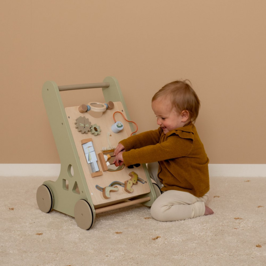 • Little Dutch dřevěné multifunkční chodítko se spoustou aktivit, které rozvíjí dětské smysly a jemnou motoriku