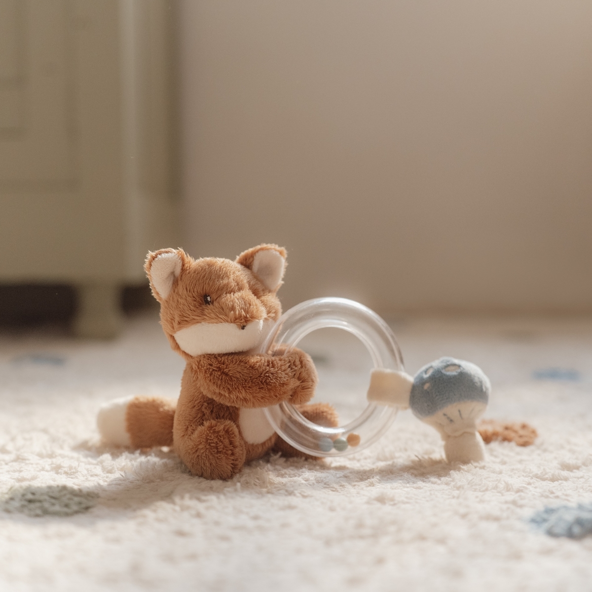 • originální chrastítko v podobě průhledného kroužku s chrasticími korálky a plyšovou liškou a houbičkou je ideální jako první hračka pro vaše miminko