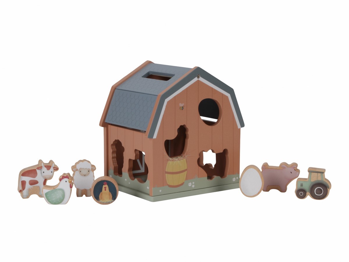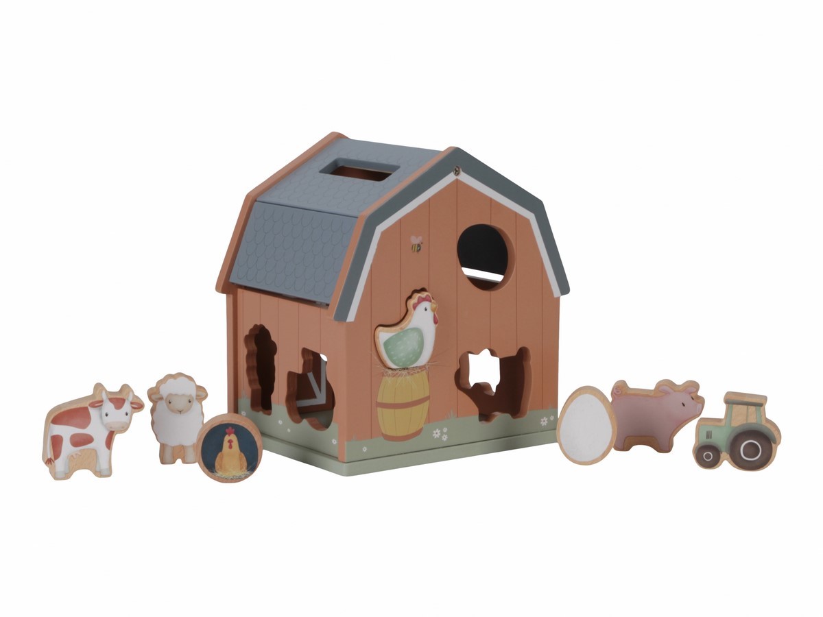 • dřevěný domek v podobě stodoly pro zvířátka učí děti kreativním způsobem rozpoznávat tvary a zdokonalit svou koordinaci oko-ruka