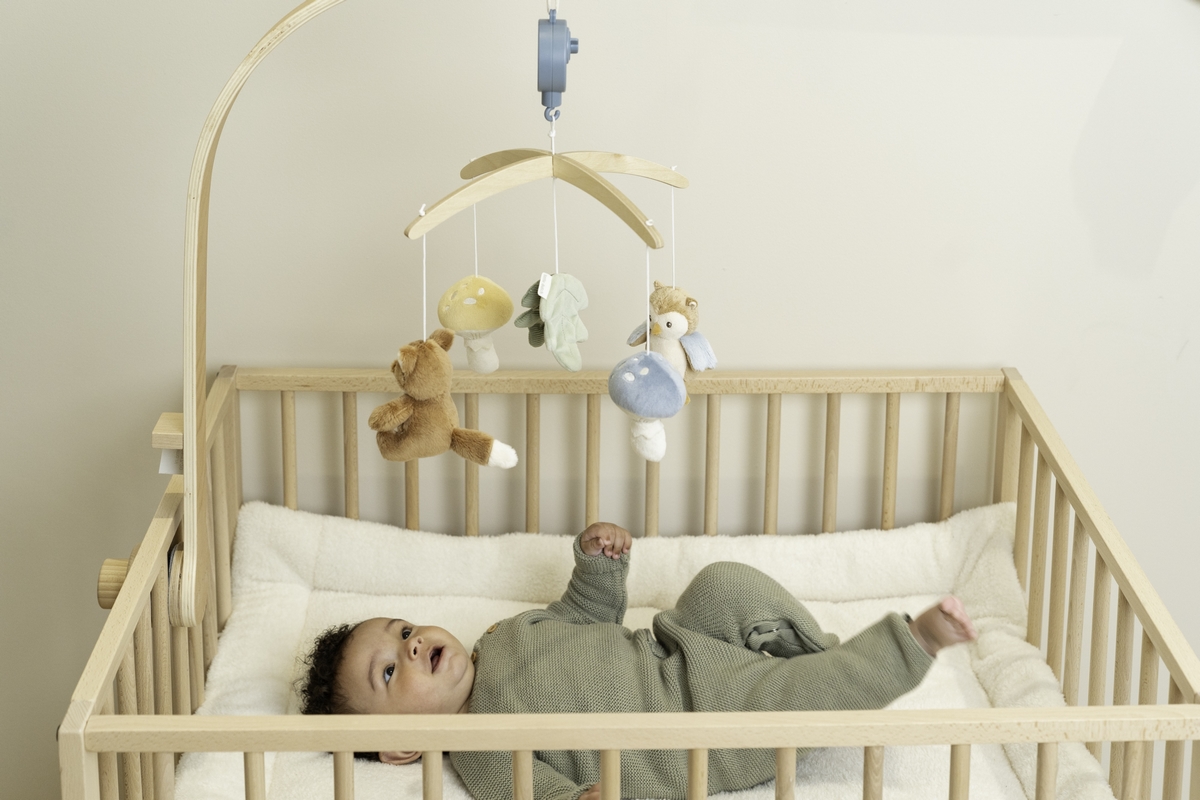 • pozornost dítěte upoutá pět otáčejících se hraček v podobě zvířátek a motivů ze života v lese