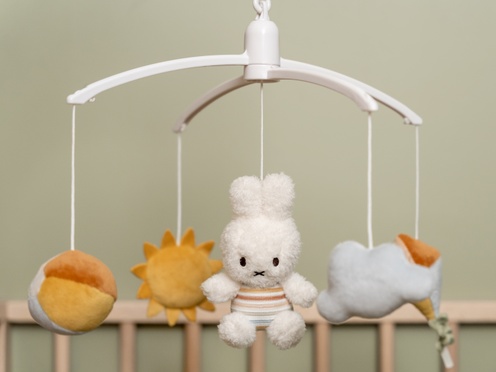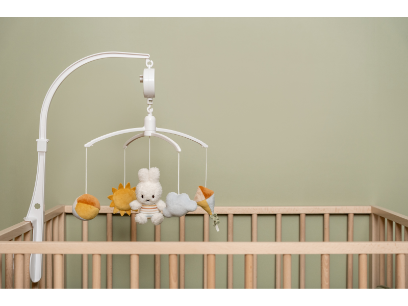 • pozornost dítěte upoutají otáčející se plyšové hračky v podobě králíčka Miffy, sluníčka, mráčku, draka a míče v pastelových barvách