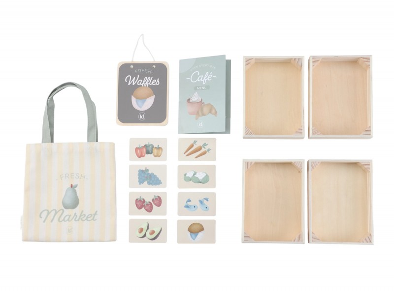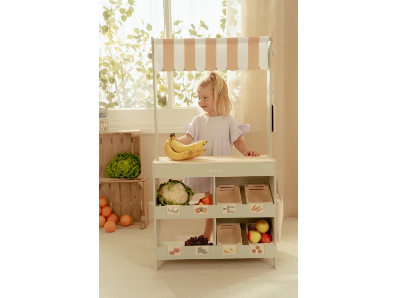• součástí je prodejní pult, pruhovaná markýza, textilní nákupní taška a čtyři bedýnky na ovoce a zeleninu