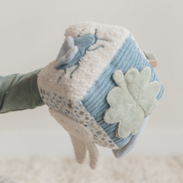 • měkká plyšová kostka je díky svému provedení snadno uchopitelná malými dětskými ručičkami