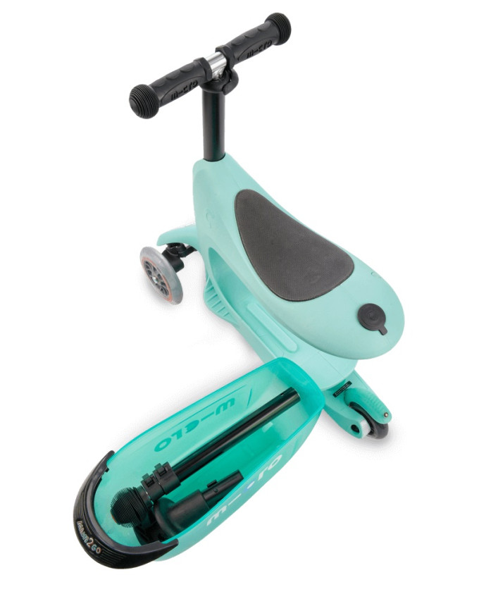 • Micro Mini2go Deluxe Plus je inovativní dětské odrážedlo s vodící tyčí a s úložným prostorem, které lze přestavět na skvělou koloběžku - trojkolku