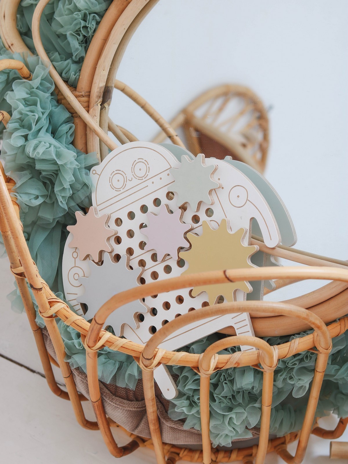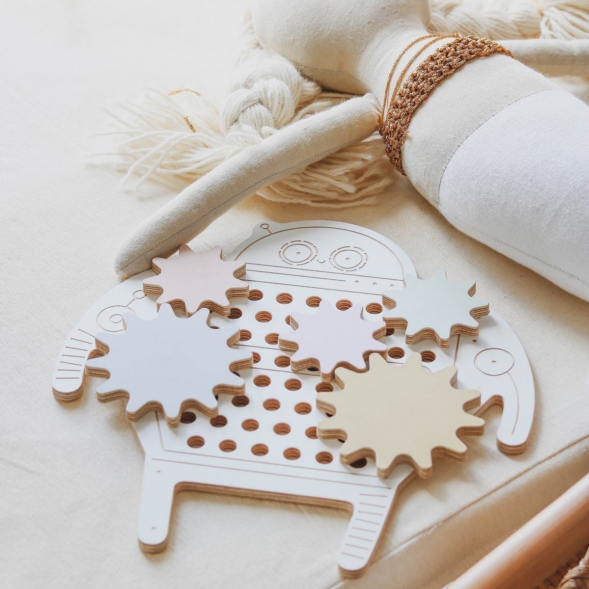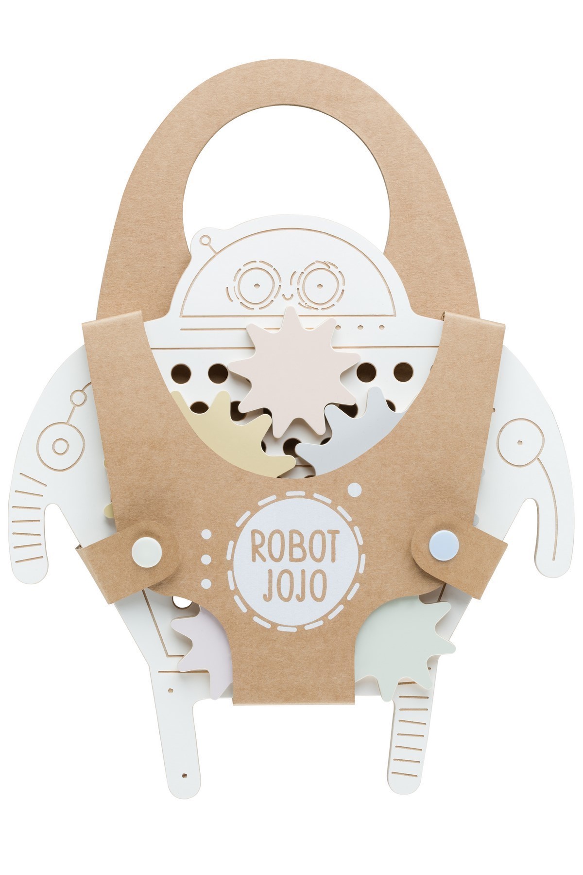 dřevěný Robot Jojo má 5 převodů, které je nutné zasadit do příslušných otvorů tak, aby se mohly otáčet současně