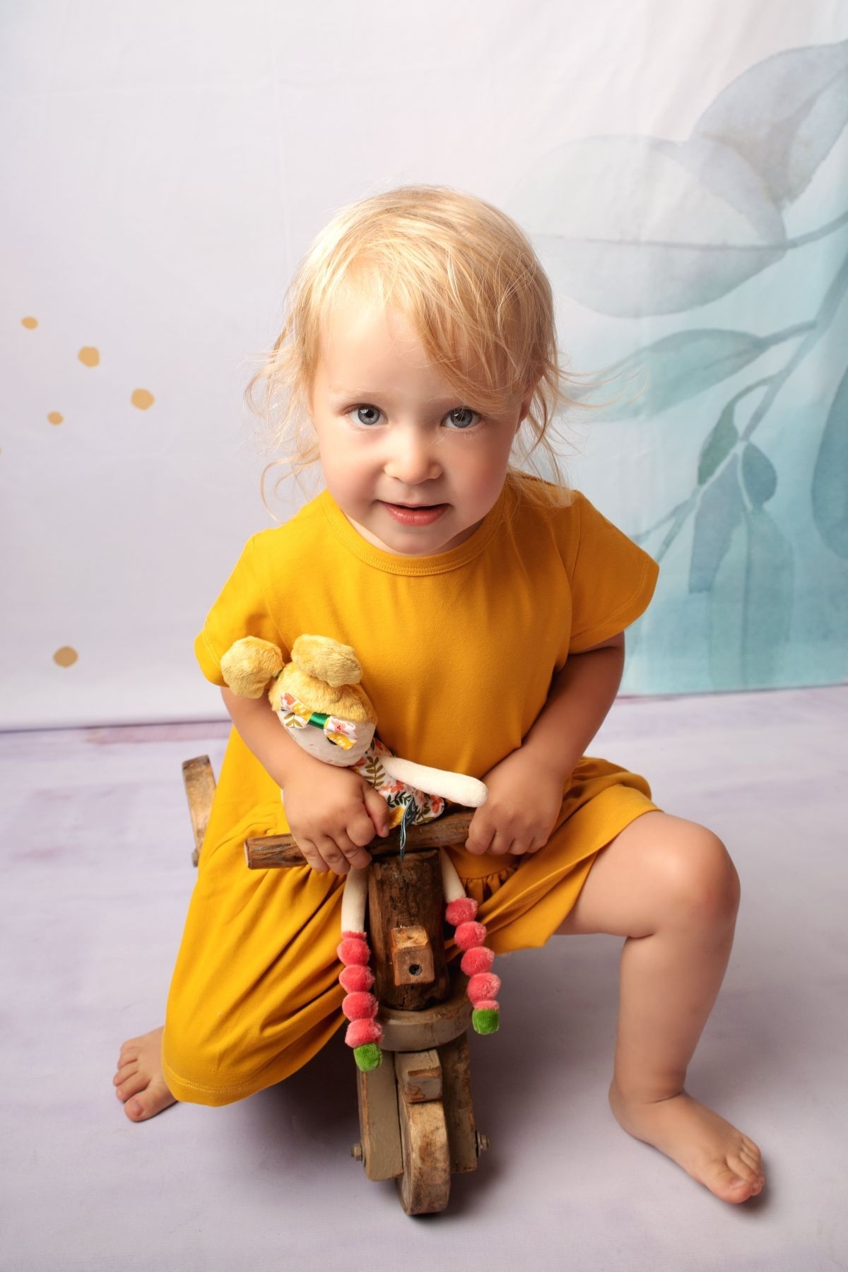 • blond culíky, mašlička ve vlasech a barevné šatičky jsou její typické znaky