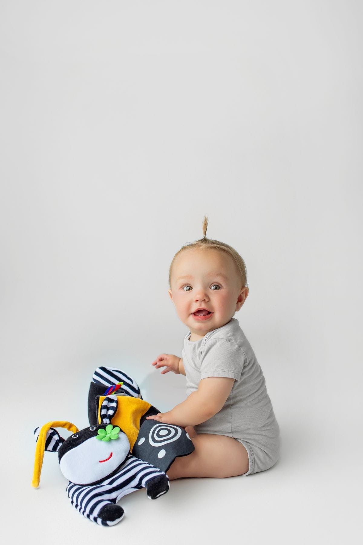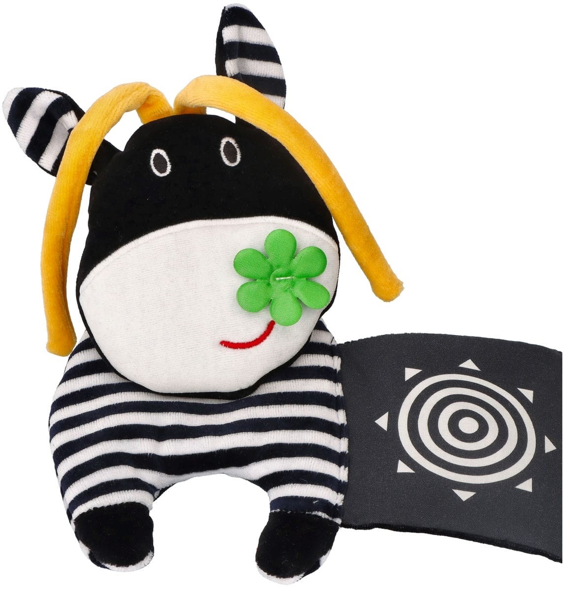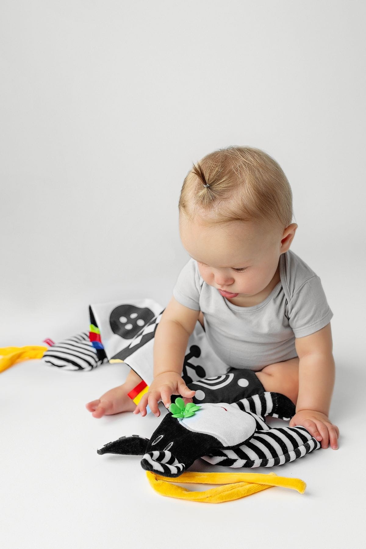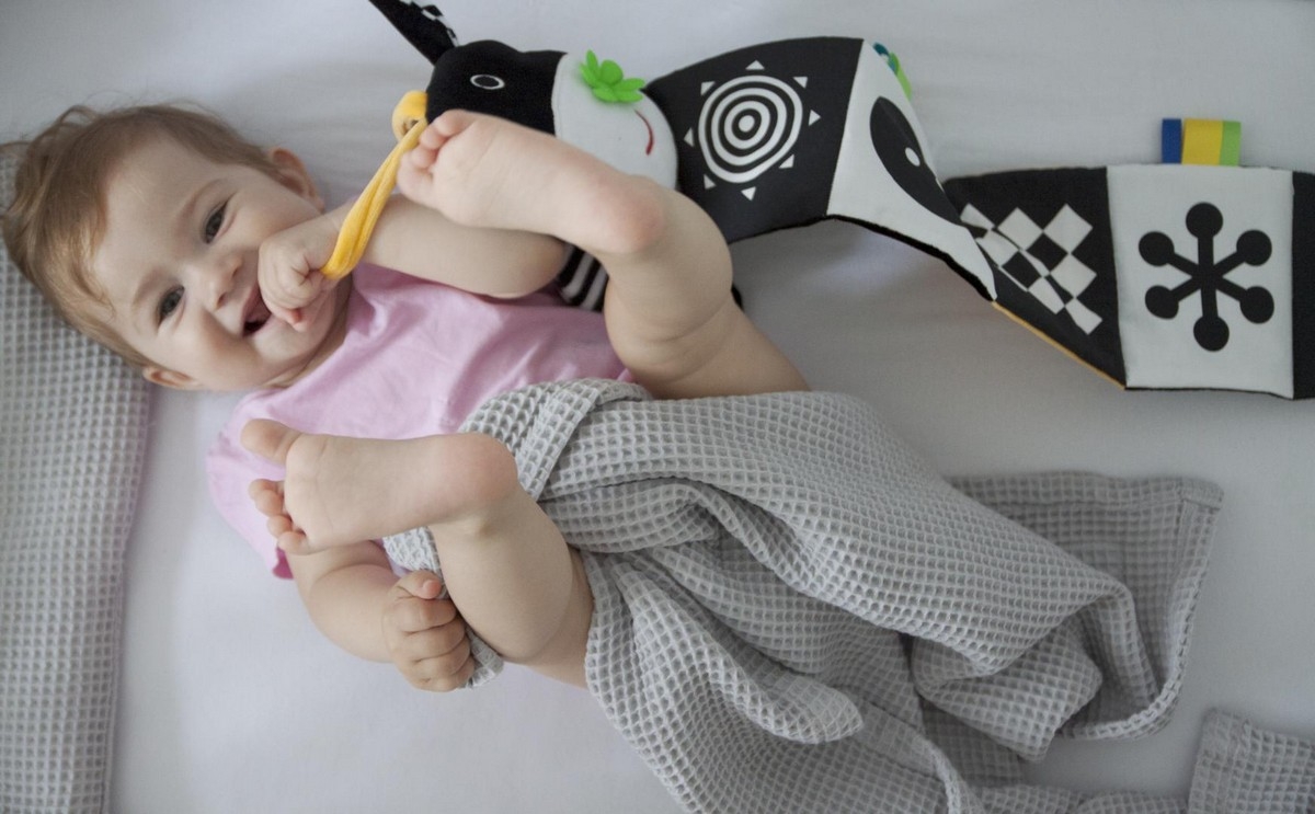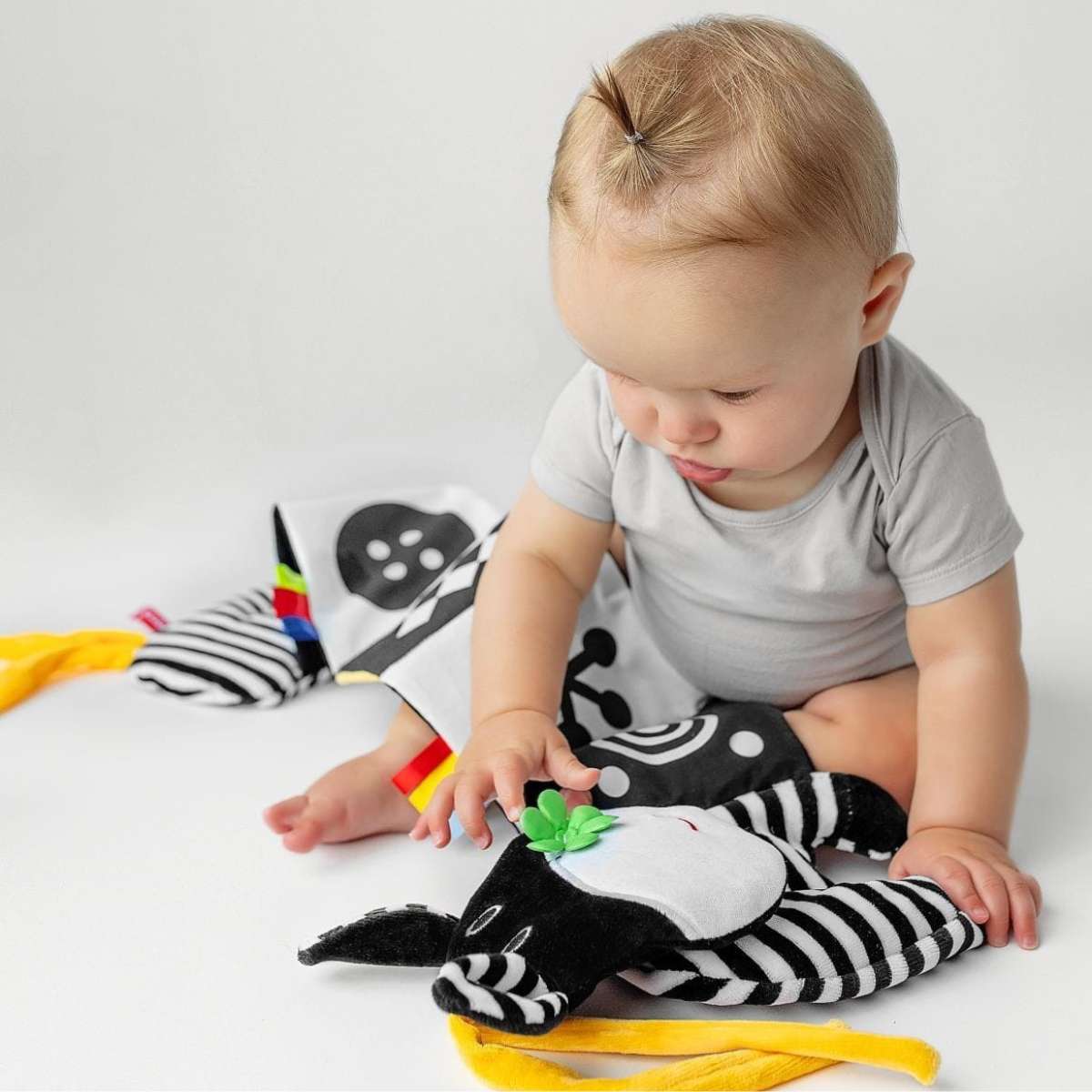 • černobílé šustící ilustrace s kontrastními prvky stimulují zrak a hmat a podporují koordinaci ruky a oka