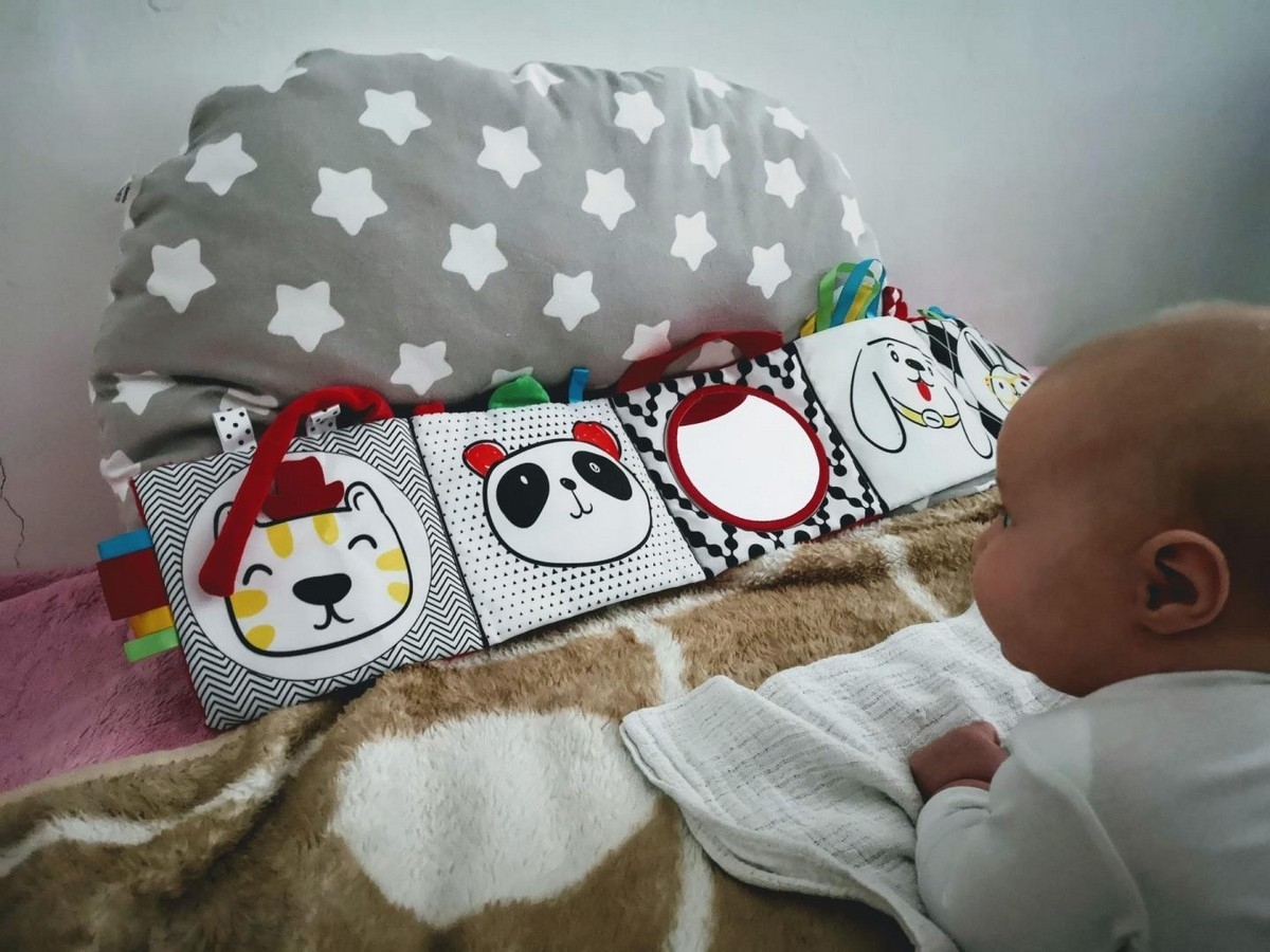 • kombinuje černobílé a červené prvky pro stimulaci zraku