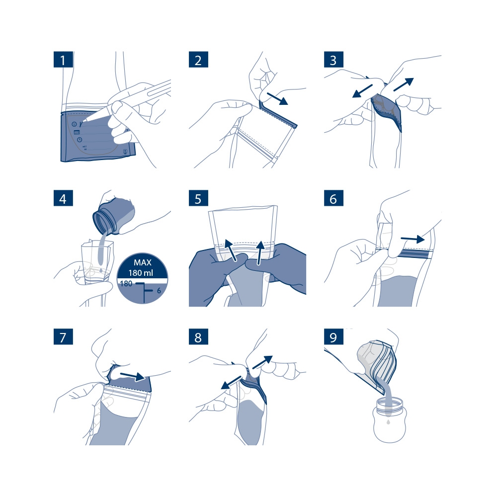 Sáčky na mateřské mléko Philips Avent mají omezenou životnost s datem spotřeby 5 (pět) let. Na obalu sáčků na mléko je uvedeno datum výroby (FAB) a datum spotřeby (EXP). Sáčky na mateřské mléko po uplynutí data spotřeby nepoužívejte, ale zlikvidujte je. Před uplynutím data spotřeby je bezpečné používat sáčky na mateřské mléko, pokud ještě nebyly otevřeny, nejsou poškozené, vypadají čistě, nejsou lepkavé a byly uloženy na čistém a tmavém místě mimo dosah přímého slunečního světla. Abyste zajistili stabilitu a chránili výrobek před poškozením, dodržujte pokyny pro skladování. Mateřské mléko v sáčcích můžete skladovat v chladničce až po dobu 4 dnů nebo v mrazničce až po dobu 6 měsíců. Nikdy nezmrazujte již jednou rozmrazené mateřské mléko a nepřidávejte čerstvé mateřské mléko do zmraženého mateřského mléka. Sáčky na mateřské mléko jsou určeny pouze pro jedno použití. Před plněním a vyprazdňováním sáčků na mateřské mléko si důkladně umyjte ruce.