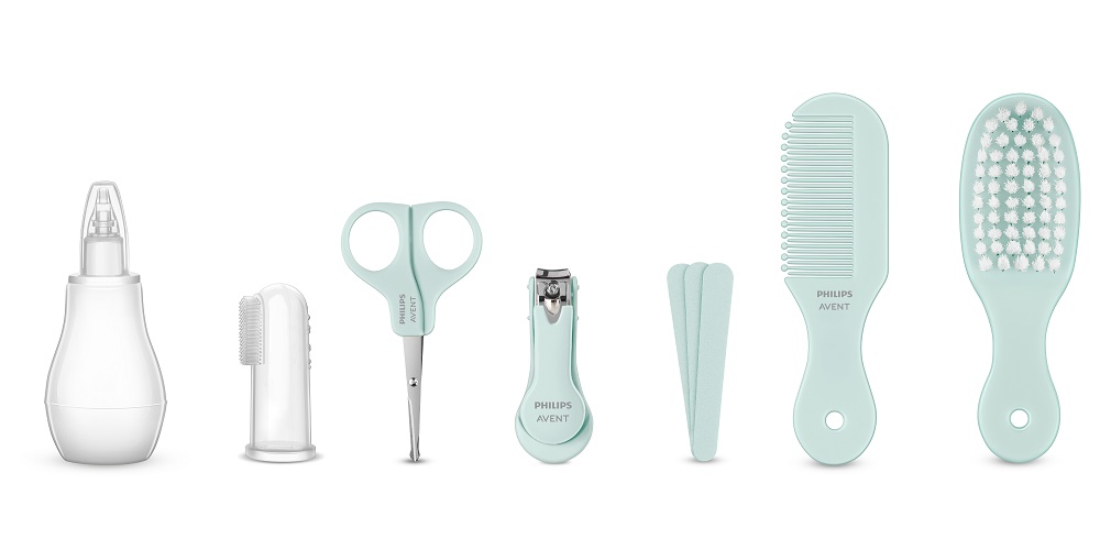 balení obsahuje nosní odsávačku s měkkou špičkou, zubní kartáček na prst a sadu pro péči o nehty a vlasy