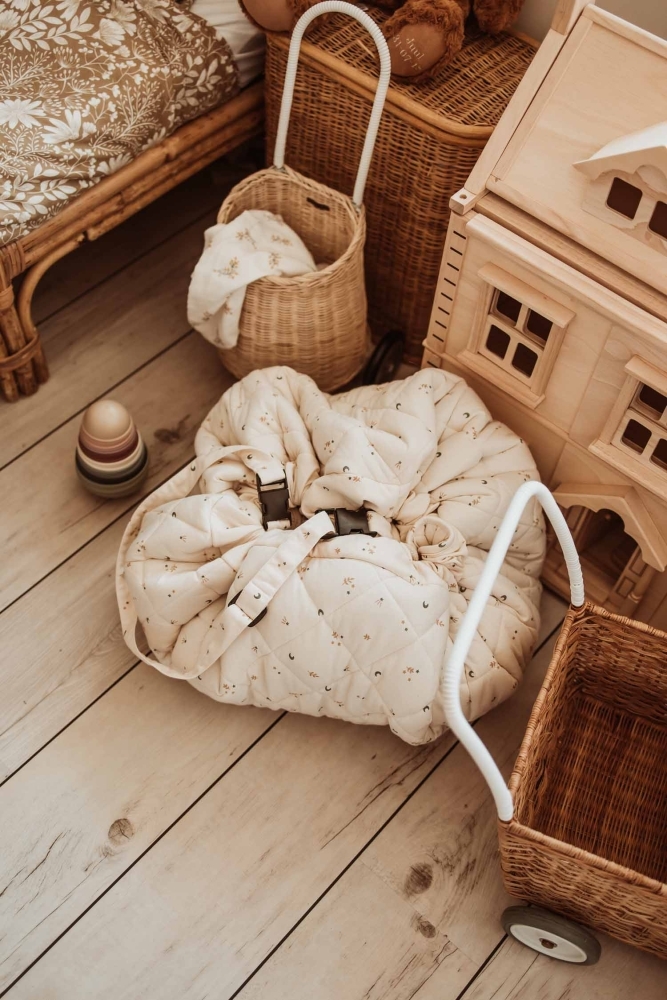 jedinečná čalouněná dětská hrací podložka, úložná taška a taška na pleny v jenom
