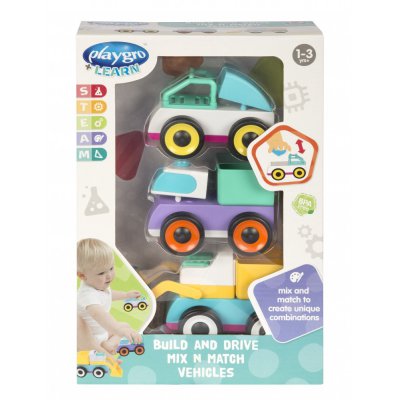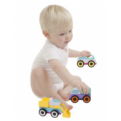 souprava od Playgro obsahuje 3 ks autíček s odnímatelnými částmi