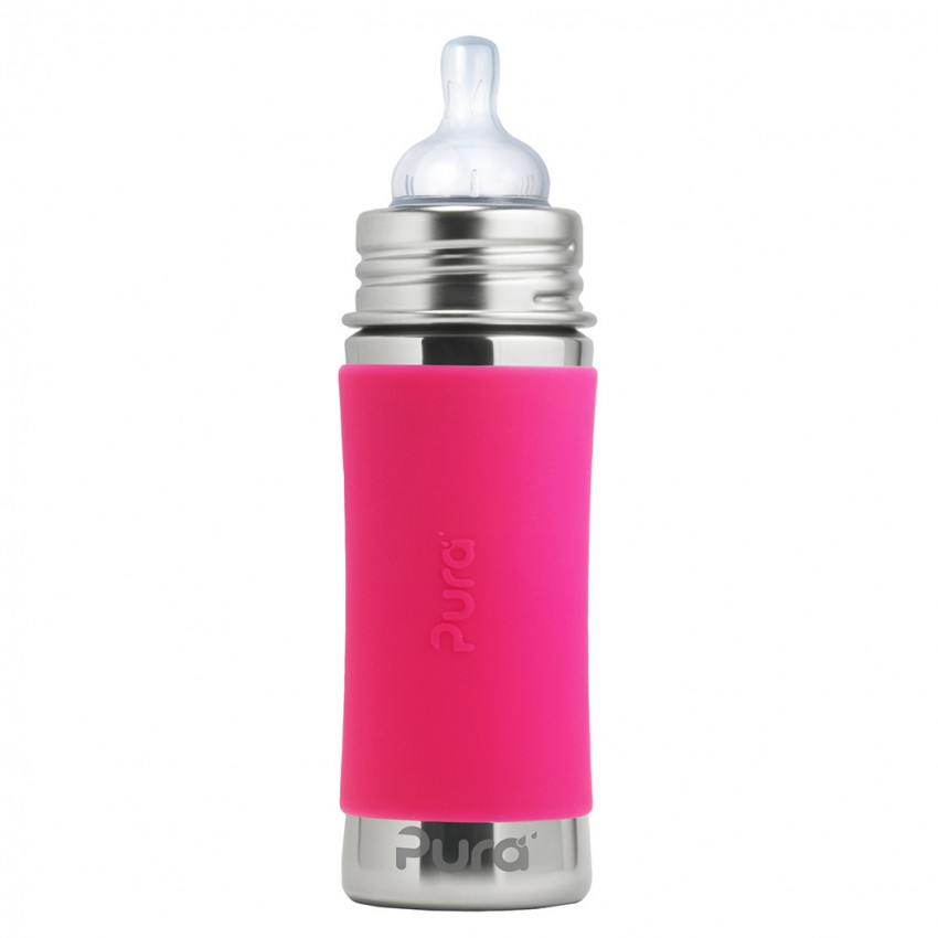 • balení obsahuje nerezovou láhev 325 ml a objímku, antikolikovou savičku Pura Natural Vent Nipple™ (střední průtok) a silikonový návlek