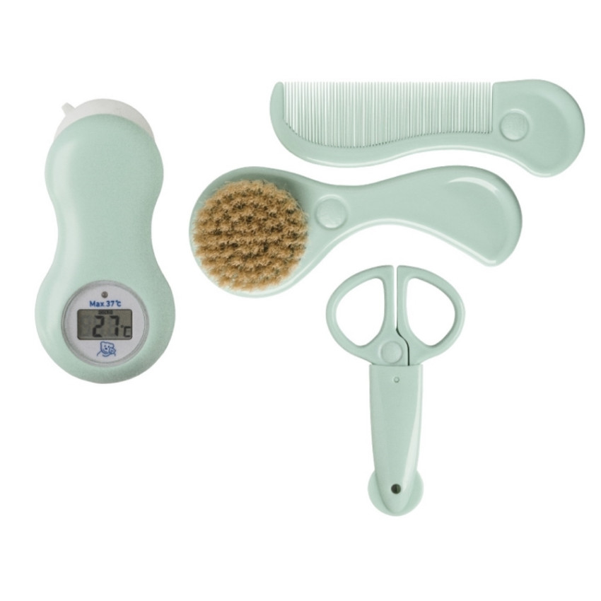 dárkový set obsahuje digitální teploměr, nůžky na nehty, hřebínek a kartáč
