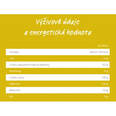 nutriční hodnoty/100 g - energ. hodnota 262 kJ / 62 kcal, tuk 1,4 g, z toho nasycené mastné kyseliny 0,2 g, sacharidy 11 g, z toho cukry 3,8 g, vláknina 0,8 g; bílkoviny 1,2 g, sůl 0 g