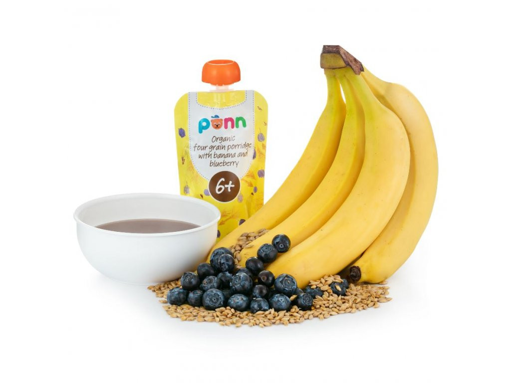 vyrobeno z vody, BIO banánového pyré (30 %), BIO borůvkového pyré (8 %), BIO obilných vloček - žito, oves, pšenice, ječmen (7 %), řepkový olej, bez přidaného cukru, umělých barviv, bez aromat a konzervantů, bez laktozy, obsahuje lepek