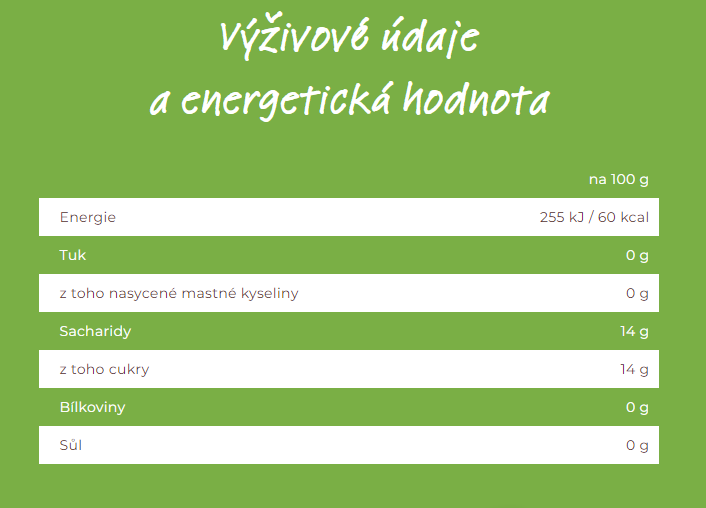 nutriční hodnoty/100 g - energ. hodnota 255 kJ / 60 kcal, tuk 0 g, z toho nasycené mastné kyseliny 0 g, sacharidy 14 g, z toho cukry 14 g, bílkoviny 0 g, sůl 0 g