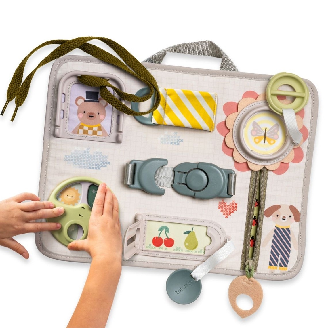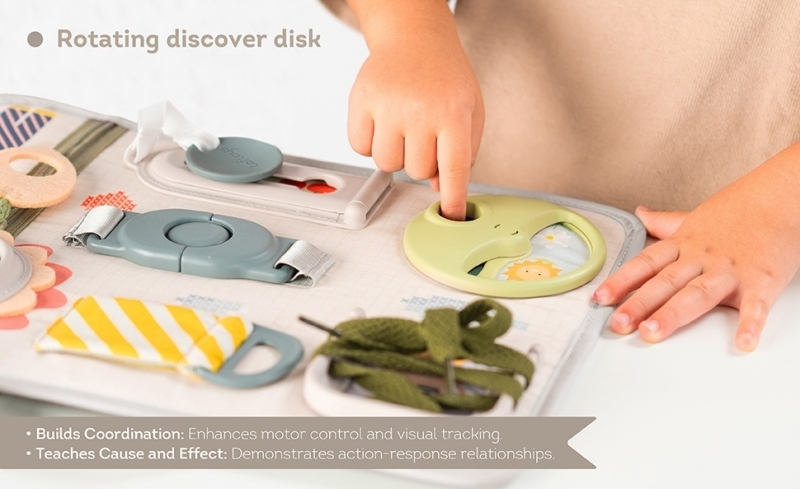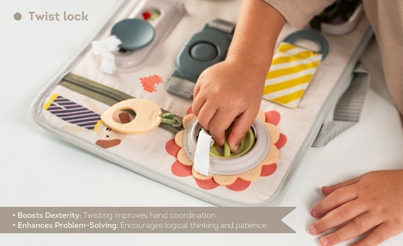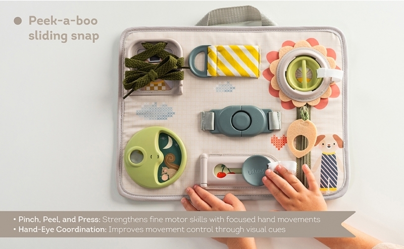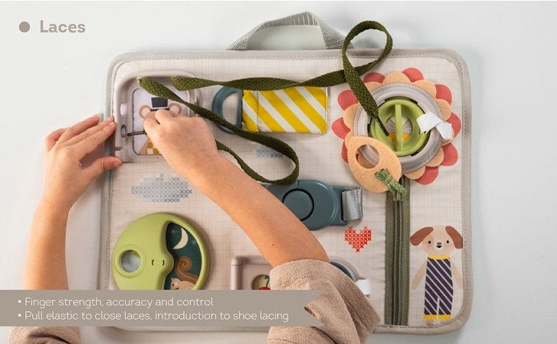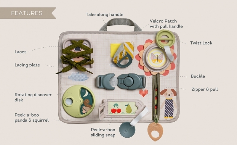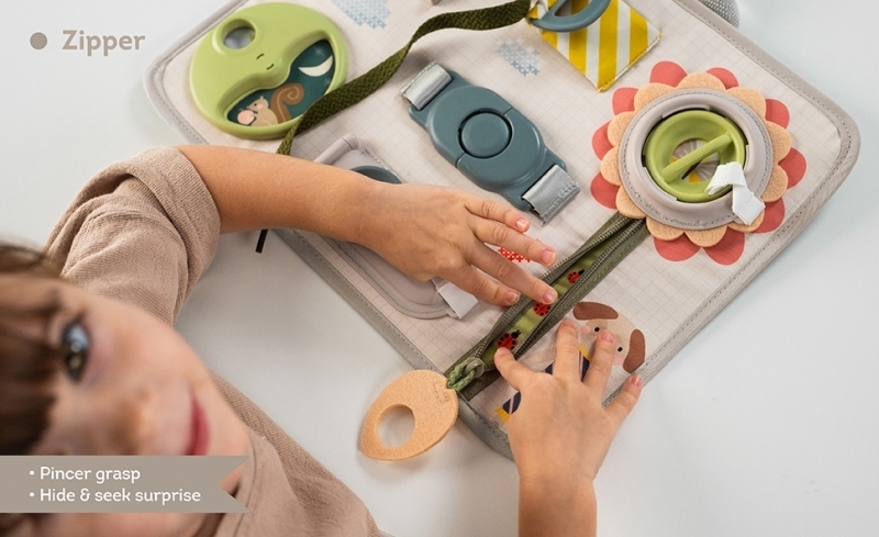 originální hrací pult nabízí množství různorodých aktivit, mezi kterými najdete zip, velký knoflík, suché zipy, tkaničky, přezku, poutko a mnoho dalšího