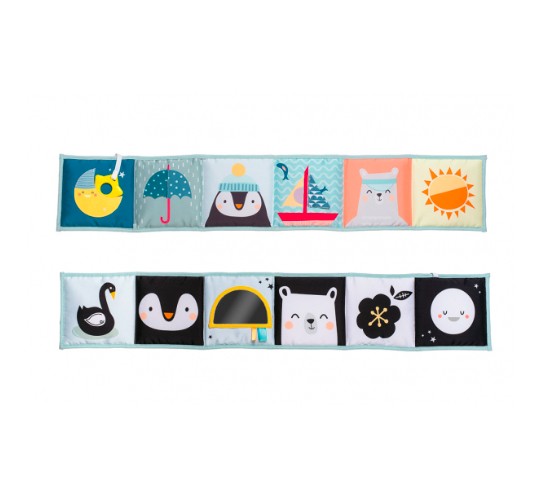 oboustranná textilní knížka pro nejmenší je určena do kočárku, postýlky i na hrací deku