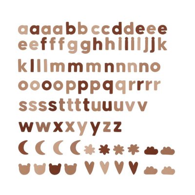 sada se skládá ze 75 malých písmen a 20 obrázků v několika barvách