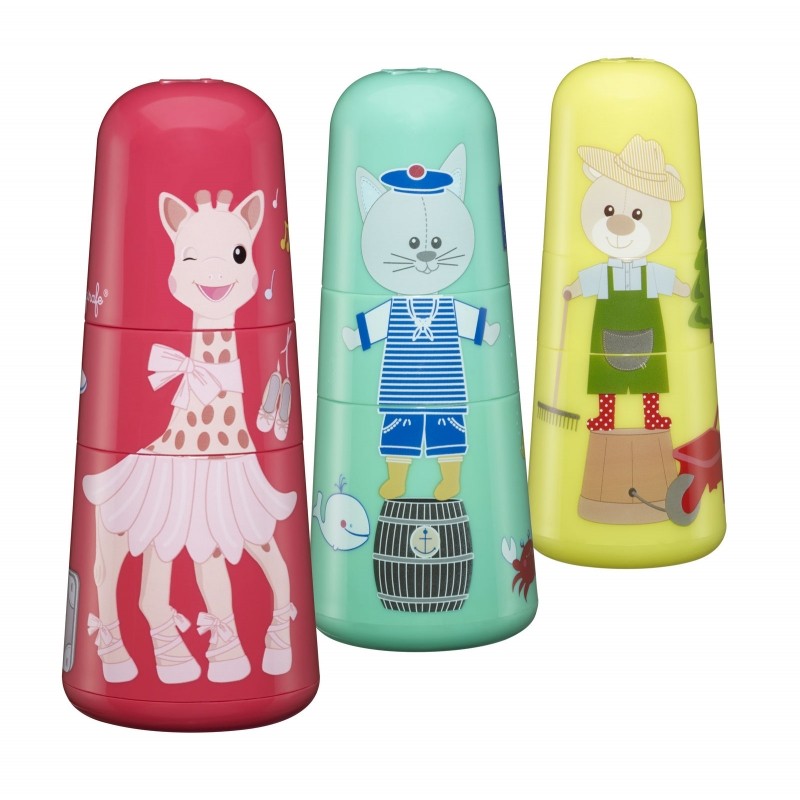 Vulli moje první 3D puzzle, na kterých se žirafa Sophie a její dva kamarádi skrývají, aby naučili vaše dítě postavit komínky od základu