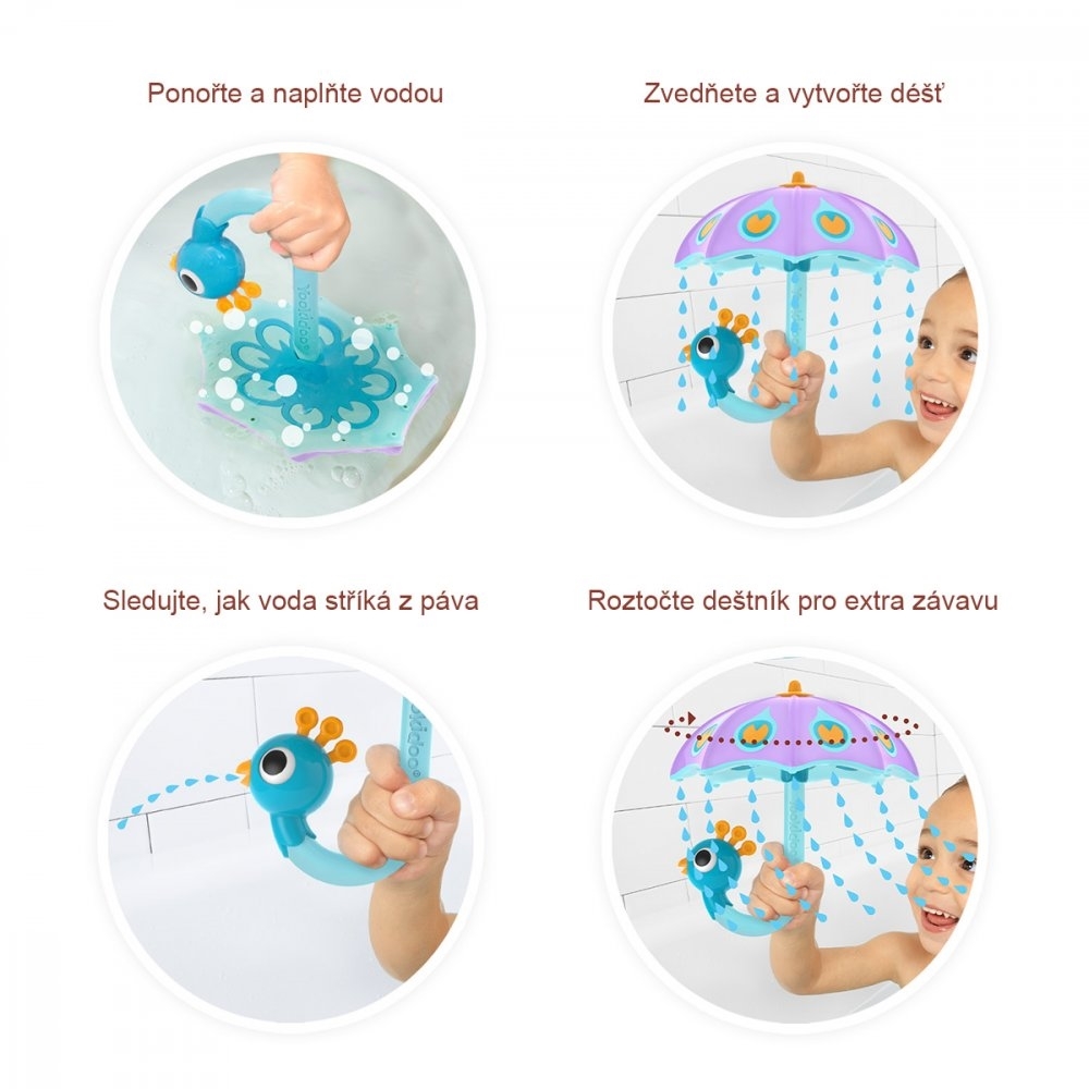 pro více zábavy roztočte deštníkem a sledujte, jak voda stříká kolem dokola