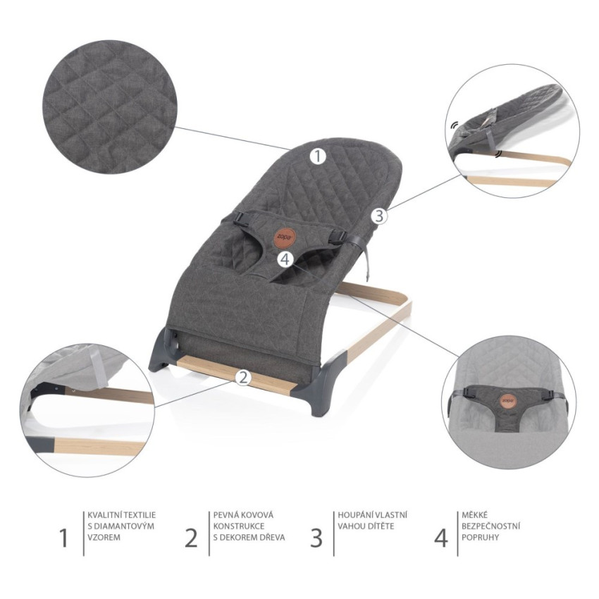 díky pevné a zároveň pružné kovové konstrukci lehačka umožňuje houpání na základě vlastní váhy dítěte nebo dítě mohou houpat rodiče